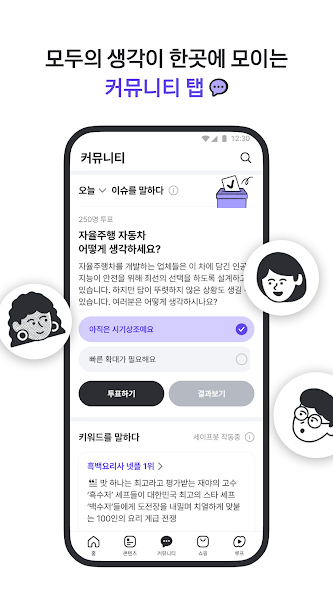앱의 인터페이스는 홈, 콘텐츠, 커뮤니티, 쇼핑 탭으로 직관적으로 나뉘어 있어 원하는 서비스로의 이동이 편리합니다. 동영상과 음악 콘텐츠는 초기 설정 상 자동 재생되도록 되어 있어 멀티미디어 접근성이 높으며, 쇼핑 탭에서는 매일 새로운 트렌드 상품을 확인할 수 있습니다.