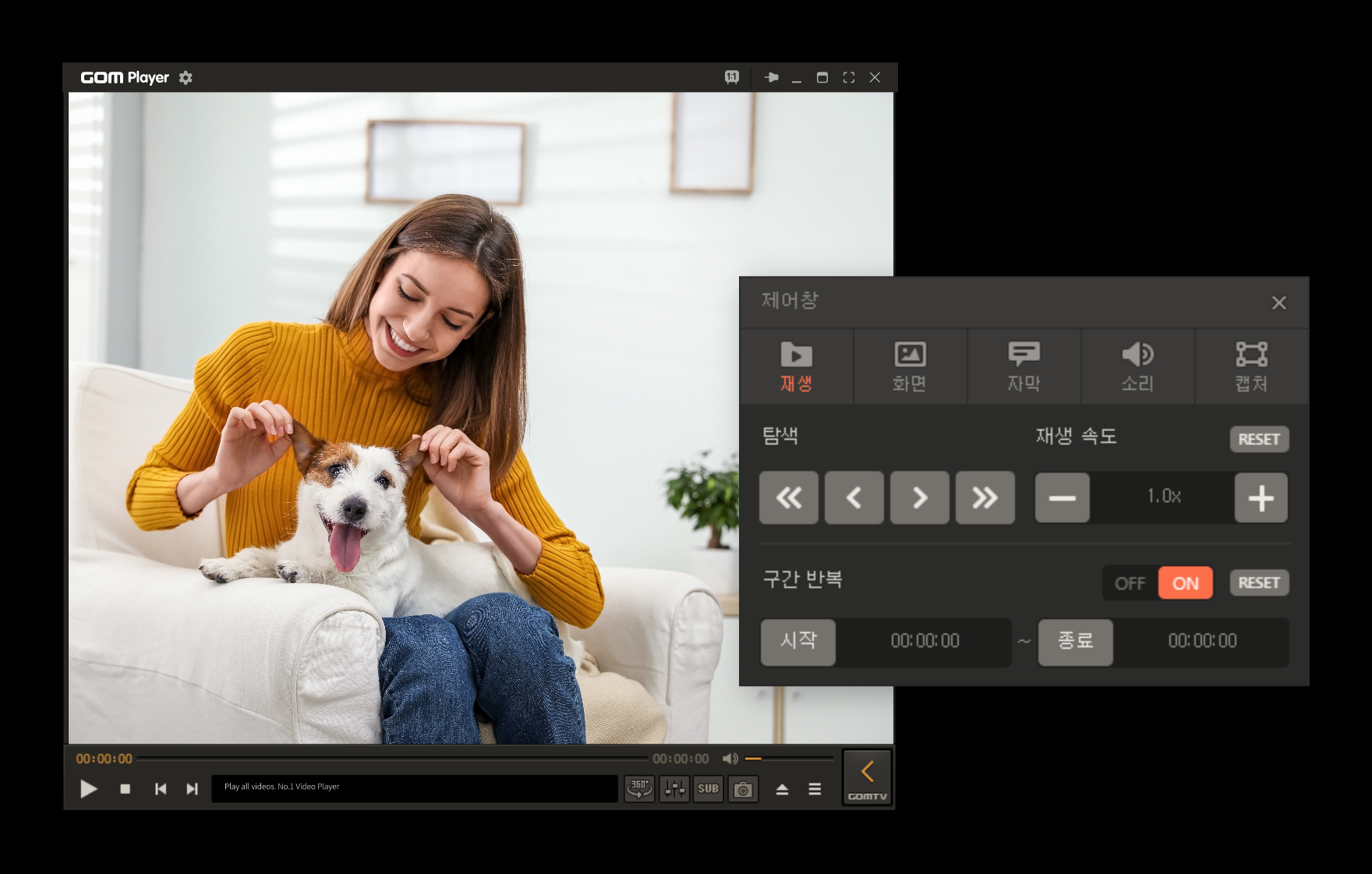 360도 VR 동영상 재생 모드를 지원하여 화면 회전과 시점 이동이 가능하며, 온라인 검색을 통한 VR 영상 재생 기능도 포함되어 있습니다. 또한 사용자가 지정한 구간을 반복 재생할 수 있고, 다중 구간을 목록으로 관리하는 기능도 제공됩니다.